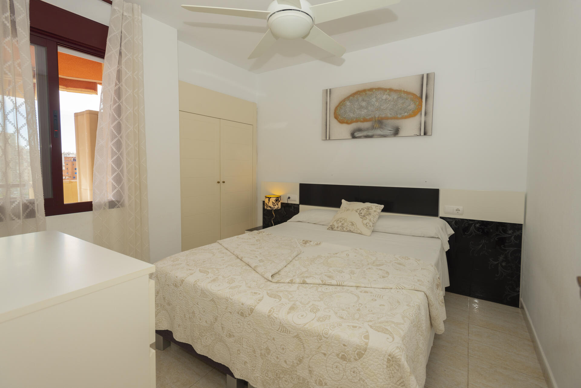 El dormitorio tiene una cama de matrimonio y dos mesitas de noche. Armario empotrado.