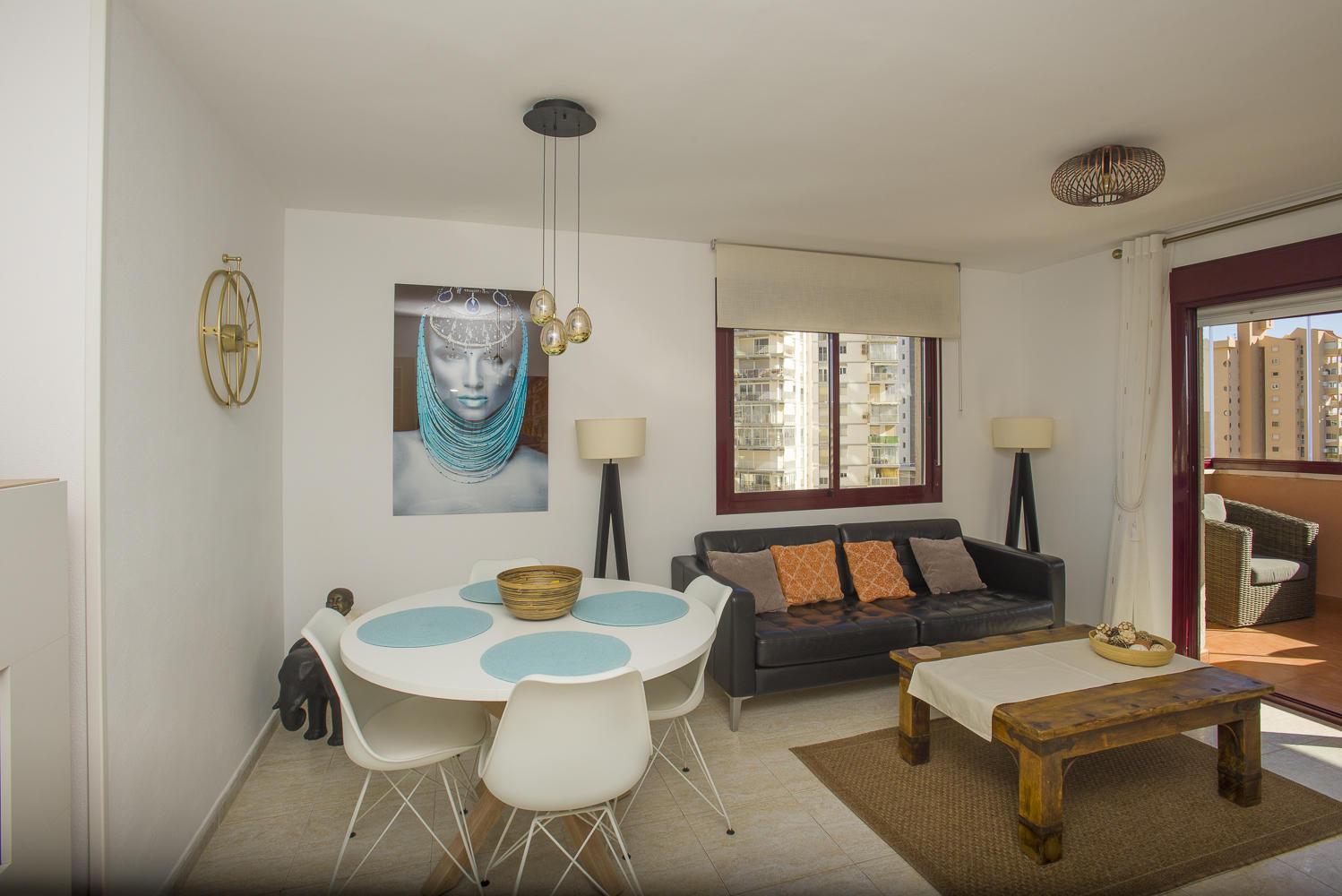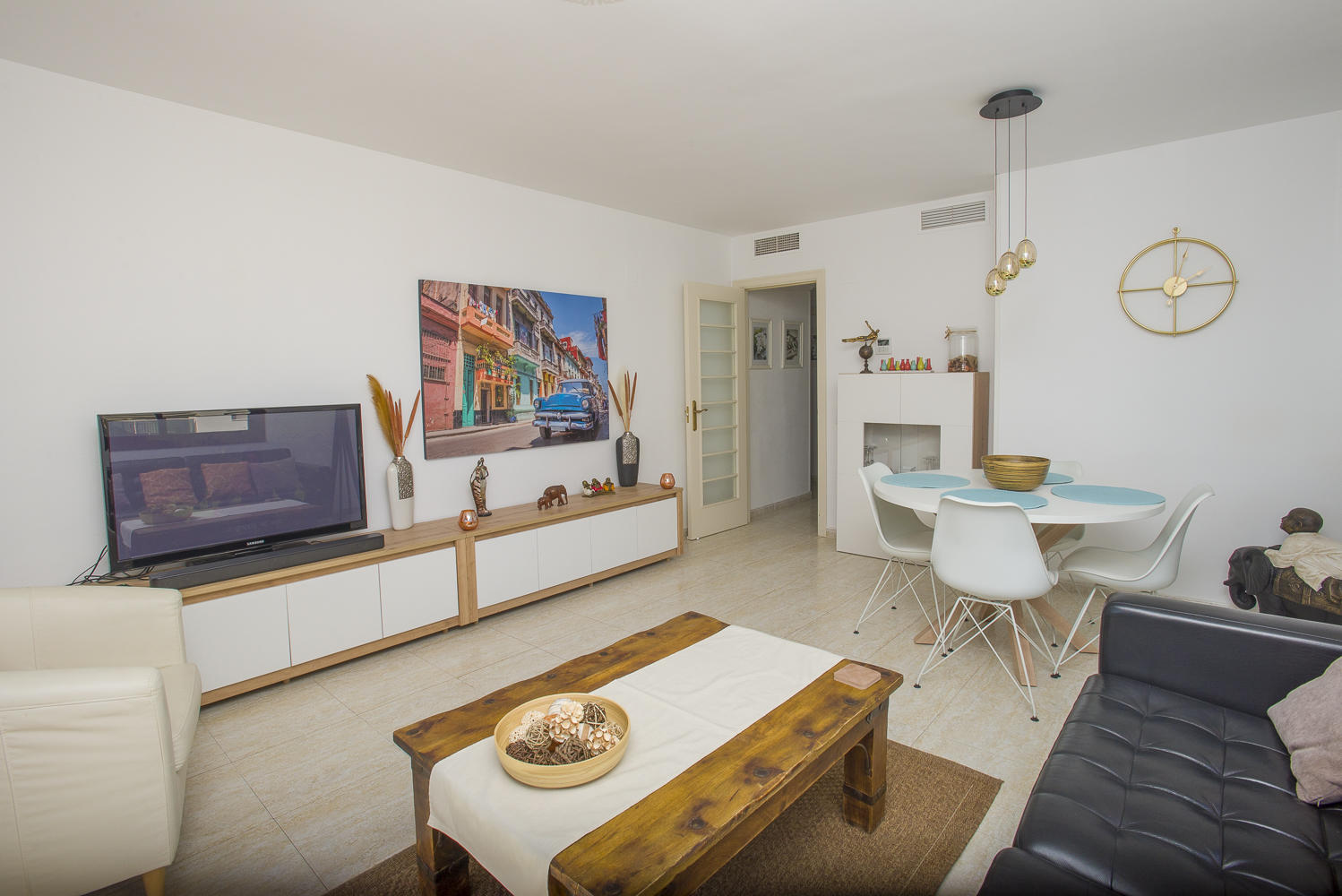 El Salón tiene una televisión,un sofá cheslongue y el comedor tiene mesa de comedor y 6 sillas. El apartamento tiene aire acondicionado por conductos en todas sus habitaciones
